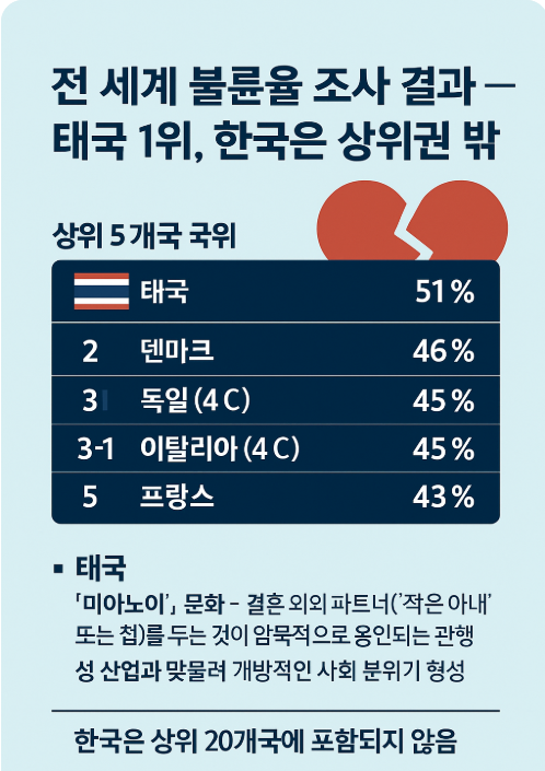 한국은 이번 조사에서 상위 20위 밖으로, 비교적 낮은 불륜율을 기록했습니다.