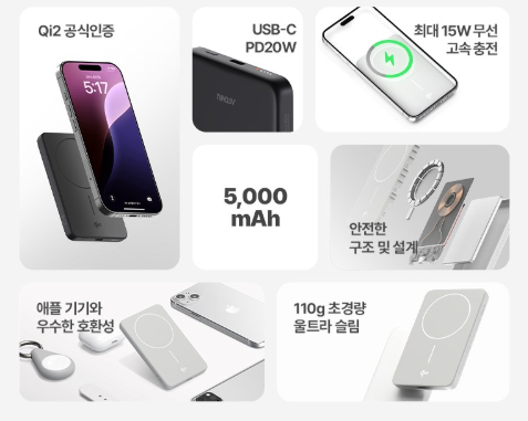 5,000mAh의 용량입니다. 가벼운게 최고다 하시면 강력추천드리는 제품입니다. USB-C PD 20W까지 출력이 됩니다.