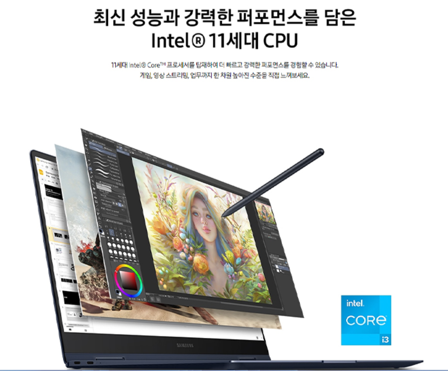 13.3인치 터치스크린에, 11세대 CPU, 8G 메모리에 가벼운 무게가 장점인데요. 360도 회전도 장점입니다.