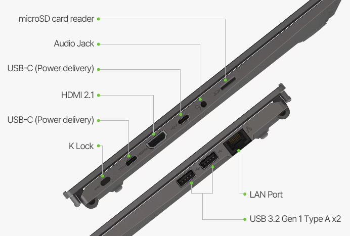 전체 스펙은 아래와 같구요 USB C 포트 2개와 HDMI 2.1을 지원합니다.