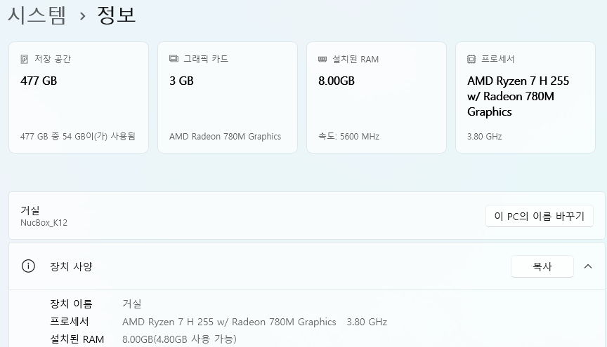요즘 메모리가 너무 비싸서 메모리를 듀얼로 못맞췄습니다. 칩셋은 H 255로 라데온 780M으로 잘 잡고 있네요.