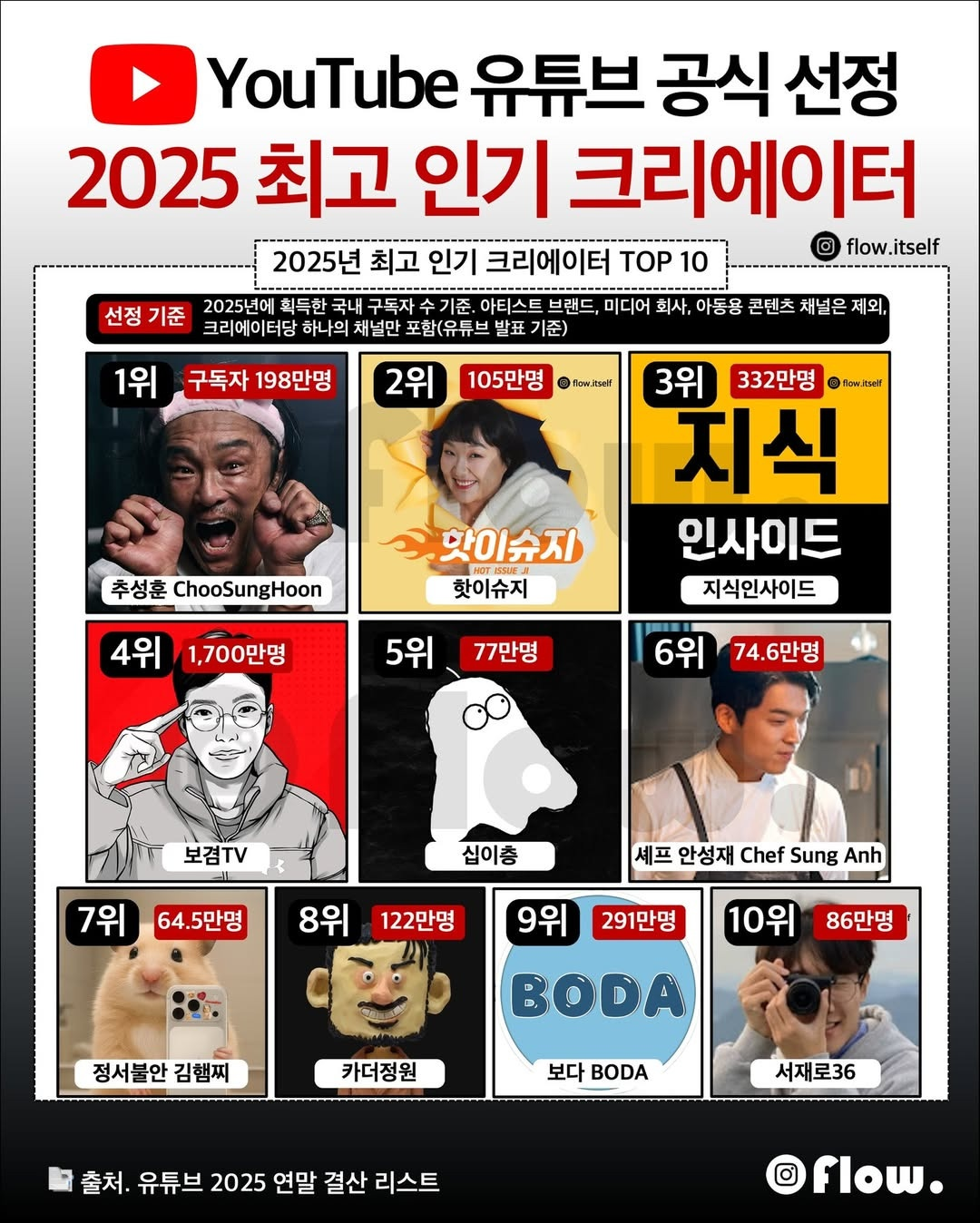 유튜브에서 2025년 인기 크리에이터 랭킹을 공개했스니다.