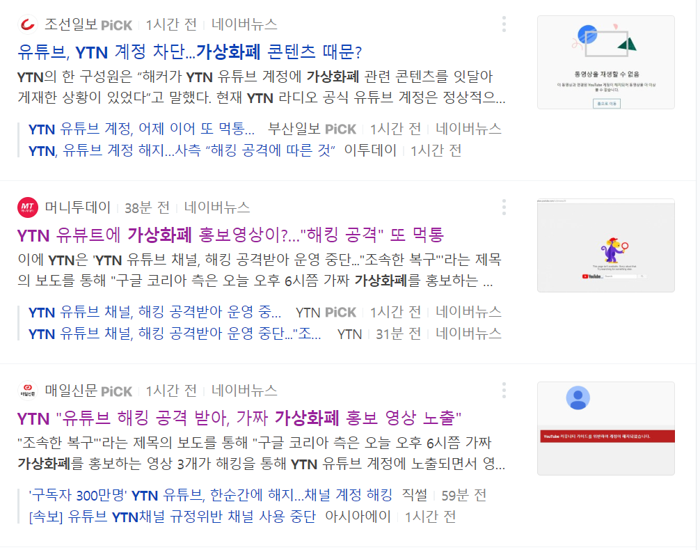 오늘 YTN의 유튜브 채널이 해킹으로 정지되었습니다.